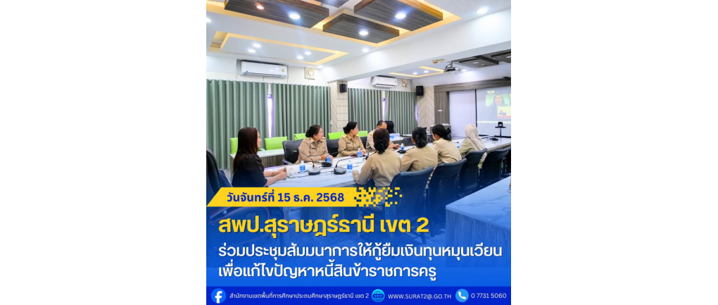 สพป.สุราษฎร์ธานี เขต 2 เข้าร่วมประชุมสัมมนาการให้กู้ยืมเงินทุนหมุนเวียนเพื่อแก้ไขปัญหาหนี้สินข้าราชการครู ประจำปีงบประมาณ พ.ศ. 2569 ผ่านระบบอิเล็กทรอนิกส์ . วันจันทร์ที่ 15 ธันวาคม 2568 -- นางสาวปวิชญา สินน้อย ผู้อำนวยการสำนักงานเขตพื้นที่การศึกษาประถมศึกษาสุราษฎร์ธานี เขต 2 พร้อมด้วยบุคลากรที่เกี่ยวข้อง เข้าร่วมการประชุมสัมมนาการให้กู้ยืมเงินทุนหมุนเวียนเพื่อแก้ไขปัญหาหนี้สินข้าราชการครู ประจำปีงบประมาณ พ.ศ. 2569 ผ่านระบบสื่ออิเล็กทรอนิกส์ (Zoom Meeting) การประชุมดังกล่าวจัดขึ้นโดยสำนักงานปลัดกระทรวงศึกษาธิการ เพื่อชี้แจงแนวทางการบริหารจัดการและจัดสรรวงเงินให้กู้ยืมฯ ประจำปีงบประมาณ พ.ศ. 2569 จำนวน 250,000,000 บาท โดยมีวัตถุประสงค์เพื่อให้การดำเนินงานผ่านระบบสารสนเทศเงินทุนหมุนเวียนเพื่อแก้ไขปัญหาหนี้สินข้าราชการครู (Working Capital for Teacher Civil Service Debt Solving Information System : WCT) เป็นไปอย่างมีประสิทธิภาพ และเพื่อให้สำนักงานเขตพื้นที่การศึกษาได้รับทราบขั้นตอนการปฏิบัติงานที่ถูกต้อง ทั้งนี้ สพป.สุราษฎร์ธานี เขต 2 จะเร่งดำเนินการประชาสัมพันธ์หลักเกณฑ์และวิธีการให้กู้ยืมเงินทุนหมุนเวียนดังกล่าวให้ข้าราชการครูและบุคลากรทางการศึกษาในสังกัดทราบ ภายในวันที่ 30 ธันวาคม 2568 โดยผู้ที่มีความประสงค์จะขอกู้ยืม สามารถยื่นคำขอผ่านระบบ WCT ได้ระหว่างวันที่ 5 มกราคม – 5 กุมภาพันธ์ 2569 เพื่อดำเนินการตามขั้นตอนการพิจารณาและตรวจสอบคุณสมบัติต่อไป