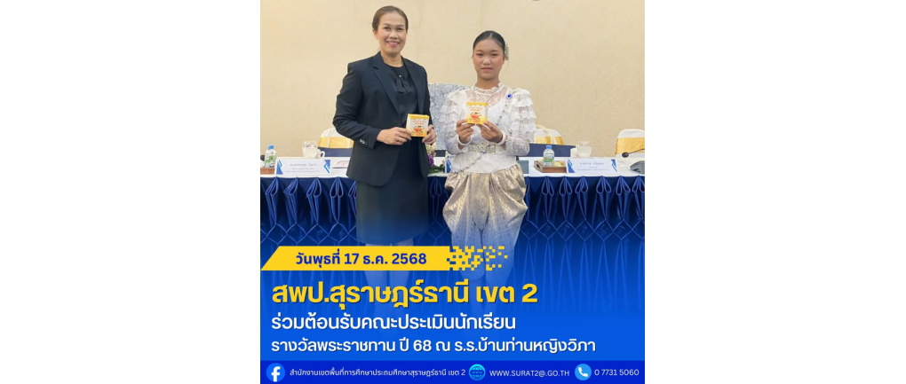 วันพุธที่ 17 ธันวาคม พ.ศ. 2568 -- นางสาวปวิชญา สินน้อย ผู้อำนวยการสำนักงานเขตพื้นที่การศึกษาประถมศึกษาสุราษฎร์ธานี เขต 2 มอบหมายให้ นางสงวนรัตน์ คงนุ่มรอง ผู้อำนวยการสำนักงานเขตพื้นที่การศึกษาประถมศึกษาสุราษฎร์ธานี เขต 2 ร่วมเป็นเกียรติและต้อนรับประเมินนักเรียน เพื่อรับรางวัลพระราชทาน ระดับการศึกษาขั้นพื้นฐาน ประจำปีการศึกษา 2568 ระดับจังหวัด เด็กหญิงเกศรินทร์ จริยะ ชั้นประถมศึกษาปีที่ 6 โรงเรียนบ้านท่านหญิงวิภา อำเภอวิภาวดี จังหวัดสุราษฎร์ธานี เพื่อคัดเลือกนักเรียนเข้ารับพระราชทานระดับกลุ่มจังหวัด เพื่อเป็นการพัฒนาคุณภาพการศึกษาทั้งนักเรียนและโรงเรียน