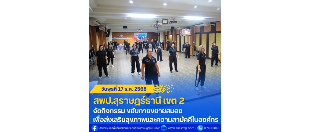 วันพุธที่ 17 ธันวาคม พ.ศ. 2568 — บุคลากรในสำนักงาน ร่วมกิจกรรม ขยับกายขยายสมอง ณ ห้องประชุมไชยชนะวดี สำนักงานเขตพื้นที่การศึกษาประถมศึกษาสุราษฎร์ธานี เขต 2
