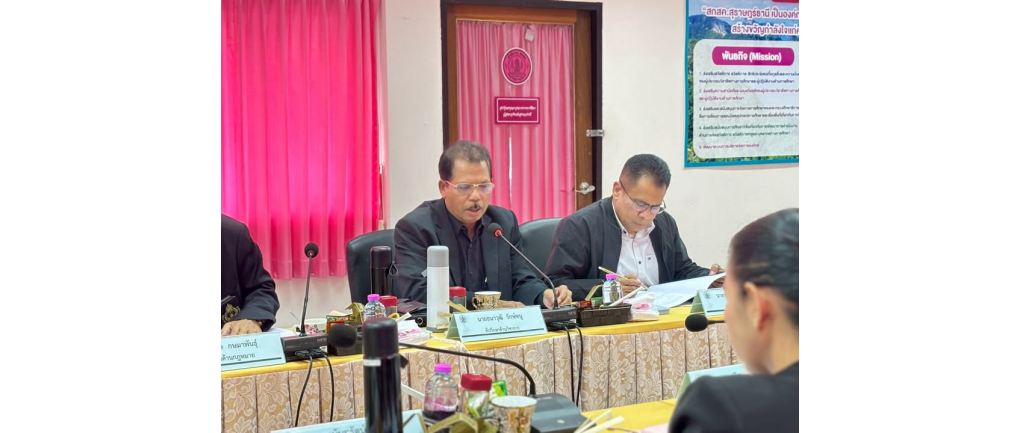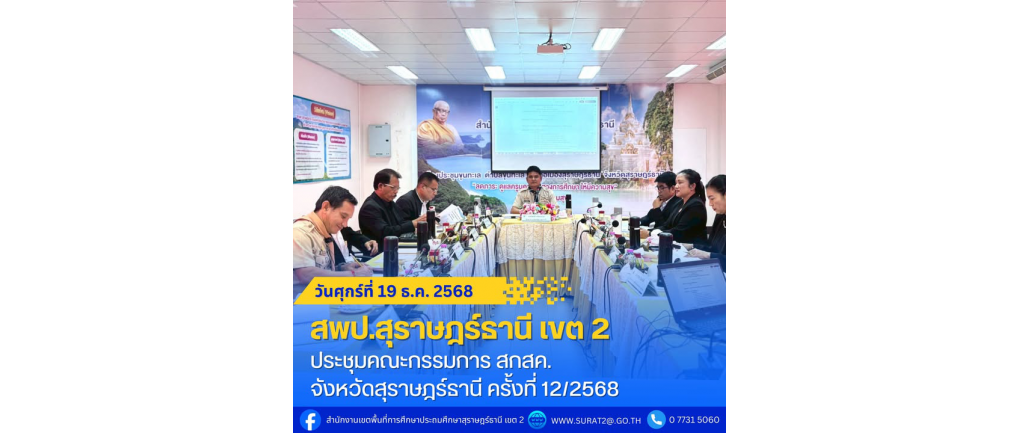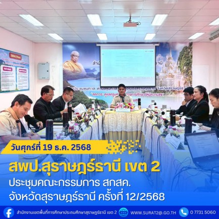 สพป.สุราษฎร์ธานี เขต 2 ร่วมประชุมคณะกรรมการ สกสค. จังหวัดสุราษฎร์รานี ครั้งที่ 12/2568 . วันศุกร์ที่ 19 ธันวาคม พ.ศ. 2568 — นางสาวปวิชญา สินน้อย ผู้อำนวยการสำนักงานเขตพื้นที่การศึกษาประถมศึกษาสุราษฎร์ธานี เขต 2 เข้าร่วมประชุมคณะกรรมการ สกสค. จังหวัดสุราษฎร์ธานี ครั้งที่ 12/2568 โดยมีนายโชคดี ศรัทธากาล ศึกษาธิการจังหวัดสุราษฎร์ธานี เป็นประธานการประชุมฯ ณ ห้องประชุมสำนักงาน สกสค. จังหวัดสุราษฎร์ธานี