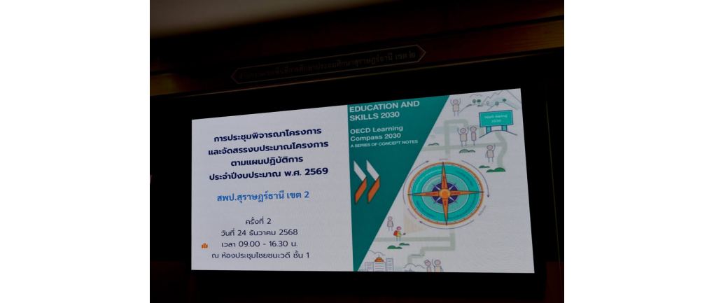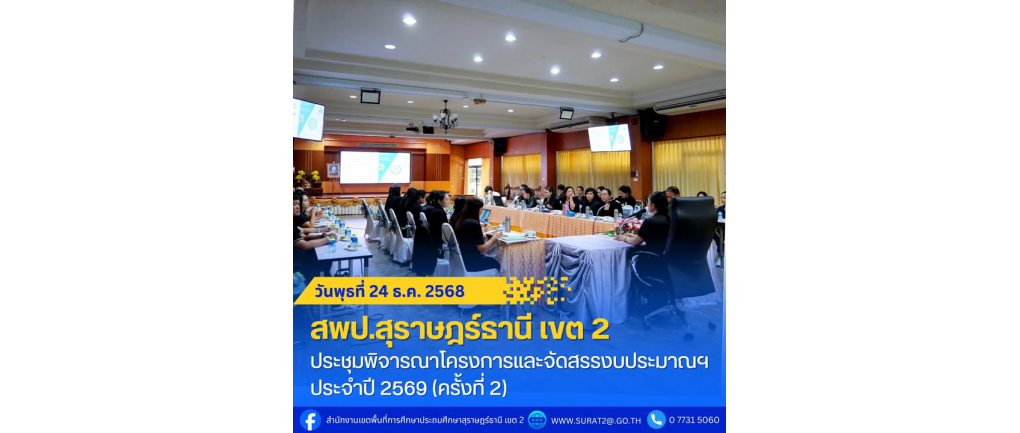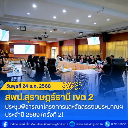 สพป.สุราษฎร์ธานี เขต 2 ประชุมพิจารณาโครงการและจัดสรรงบประมาณฯ ประจำปี 2569 (ครั้งที่ 2) มุ่งเน้นความคุ้มค่าและสอดคล้องนโยบาย “เรียนดี มีคุณธรรม” . วันที่ 24 ธันวาคม 2568 เวลา 09.00 น.-- นางสาวปวิชญา สินน้อย ผู้อำนวยการสำนักงานเขตพื้นที่การศึกษาประถมศึกษาสุราษฎร์ธานี เขต 2 เป็นประธานในการประชุมพิจารณาโครงการและจัดสรรงบประมาณโครงการตามแผนปฏิบัติการประจำปีงบประมาณ พ.ศ. 2569 (ครั้งที่ 2) ณ ห้องประชุมไชยชนะวดี ชั้น 1 อาคารสำนักงานเขตพื้นที่การศึกษาประถมศึกษาสุราษฎร์ธานี เขต 2 โดยการประชุมในครั้งนี้ มีวัตถุประสงค์เพื่อพิจารณาโครงการที่ผู้รับผิดชอบได้นำไปทบทวน ปรับปรุง และจัดทำใหม่ ตามมติและข้อเสนอแนะจากการประชุมครั้งที่ผ่านมา (ครั้งที่ 1/2568) เพื่อให้การดำเนินงานมีความสอดคล้องกับแผนพัฒนาการศึกษาขั้นพื้นฐาน ระยะ 5 ปี (พ.ศ. 2566 – 2570) และนโยบายจุดเน้นของสำนักงานคณะกรรมการการศึกษาขั้นพื้นฐาน โดยมุ่งเน้นการบูรณาการ หลีกเลี่ยงความซ้ำซ้อน และให้ความสำคัญกับผลลัพธ์ที่เกิดกับผู้เรียนเป็นสำคัญ ในการนี้ มีผู้รับผิดชอบโครงการจากกลุ่มต่างๆ นำเสนอรายละเอียดโครงการรวมทั้งสิ้น 33 โครงการ ประกอบด้วย โครงการจากกลุ่มนิเทศ ติดตาม และประเมินผลการจัดการศึกษา, กลุ่มส่งเสริมการจัดการศึกษา, กลุ่มอำนวยการ, กลุ่มบริหารงานบุคคล, กลุ่มพัฒนาครูและบุคลากรทางการศึกษา, กลุ่มนโยบายและแผน, กลุ่มส่งเสริมการศึกษาทางไกลฯ (ICT) และกลุ่มบริหารงานการเงินและสินทรัพย์ เพื่อให้คณะกรรมการบริหารงบประมาณร่วมกันพิจารณาความเหมาะสมของการจัดสรรงบประมาณ ภายใต้วงเงินงบประมาณเขตพื้นที่ เพื่อให้การขับเคลื่อนแผนปฏิบัติการประจำปีงบประมาณ พ.ศ. 2569 เป็นไปอย่างมีประสิทธิภาพและเกิดผลสัมฤทธิ์ที่เป็นรูปธรรมต่อไป