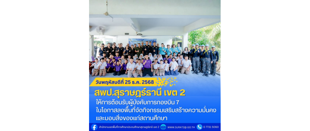 สุราษฎร์ธานี เขต 2 ให้การต้อนรับผู้บังคับการกองบิน 7 ในโอกาสลงพื้นที่จัดกิจกรรมเสริมสร้างความมั่นคงและมอบสิ่งของแก่สถานศึกษา . วันที่25 ธันวาคม 2568 -- นางสาวปวิชญา สินน้อย ผู้อำนวยการสำนักงานเขตพื้นที่การศึกษาประถมศึกษาสุราษฎร์ธานี เขต 2 มอบหมายให้ นางธัญกาญจน์ ภาสตโรจน์ รองผู้อำนวยการสำนักงานเขตพื้นที่การศึกษาประถมศึกษาสุราษฎร์ธานี เขต 2 เป็นผู้แทนในการให้การต้อนรับ นาวาอากาศเอก ศุภวัจน์ จิตรมนตรี ผู้บังคับการกองบิน 7 และคณะ ในโอกาสเดินทางมาจัดกิจกรรมเสริมสร้างความร่วมมือของชุมชนเพื่อสร้างความมั่นคง และมอบสิ่งของสนับสนุนให้กับโรงเรียนในสังกัด ได้แก่ โรงเรียนบ้านหนองจอก โรงเรียนบ้านนาค้อ และโรงเรียนบ้านบ่อกรัง ณ โรงเรียนบ้านหนองจอก ตำบลท่าสะท้อน อำเภอพุนพิน จังหวัดสุราษฎร์ธานี . สำหรับการจัดกิจกรรมในครั้งนี้ กองบิน 7 ได้เล็งเห็นถึงความสำคัญของการสร้างความสัมพันธ์อันดีระหว่างหน่วยงานและชุมชน โดยเฉพาะในพื้นที่โรงเรียนบ้านหนองจอก ซึ่งตั้งอยู่ในพื้นที่ราบลุ่มริมแม่น้ำตาปีและมักประสบปัญหาอุทกภัยในช่วงฤดูน้ำหลาก การลงพื้นที่ในครั้งนี้จึงเป็นการออกช่วยเหลือประชาชนและเสริมสร้างขวัญกำลังใจให้กับคณะครู นักเรียน และบุคลากรทางการศึกษา โดยทางสำนักงานเขตพื้นที่การศึกษาประถมศึกษาสุราษฎร์ธานี เขต 2 ได้กล่าวขอบคุณกองบิน 7 ที่ให้ความอนุเคราะห์และสนับสนุนการจัดการศึกษาด้วยดีเสมอมา