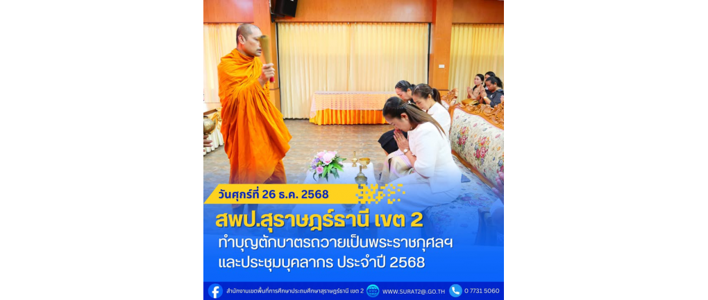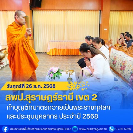 ผอ.สพป.สุราษฎร์ธานี เขต 2 นำคณะผู้บริหารและบุคลากร ทำบุญตักบาตรถวายเป็นพระราชกุศลฯ พร้อมมอบนโยบาย “9 วิธีสร้างสุข” ในการประชุมบุคลากร ประจำปี 2568 . เมื่อวันที่ 26 ธันวาคม 2568 -- ๅนางสาวปวิชญา สินน้อย ผู้อำนวยการสำนักงานเขตพื้นที่การศึกษาประถมศึกษาสุราษฎร์ธานี เขต 2 พร้อมด้วยคณะผู้บริหาร ข้าราชการครู และบุคลากรทางการศึกษาในสังกัด ร่วมพิธีทำบุญตักบาตรข้าวสารอาหารแห้งแด่พระสงฆ์ จำนวน 5 รูป เนื่องในโอกาสวันขึ้นปีใหม่ พุทธศักราช 2569 เพื่อถวายเป็นพระราชกุศลแด่สมเด็จพระนางเจ้าสิริกิติ์ พระบรมราชินีนาถ พระบรมราชชนนีพันปีหลวง และเพื่อความเป็นสิริมงคลแก่หน่วยงานและบุคลากร ณ บริเวณสำนักงานเขตพื้นที่การศึกษาประถมศึกษาสุราษฎร์ธานี เขต 2 จากนั้น เวลา 13.00 น. นางสาวปวิชญา สินน้อย เป็นประธานในการประชุมบุคลากรสำนักงานเขตพื้นที่การศึกษาประถมศึกษาสุราษฎร์ธานี เขต 2 ณ ห้องประชุมไชยชนะวดี เพื่อมอบนโยบาย แจ้งข้อราชการ และซักซ้อมความเข้าใจในการปฏิบัติหน้าที่ราชการให้เป็นไปตามเป้าหมายและทิศทางเดียวกัน ในการนี้ ผู้อำนวยการสำนักงานเขตพื้นที่การศึกษาประถมศึกษาสุราษฎร์ธานี เขต 2 ได้เน้นย้ำเรื่องการสร้างความสุขในการทำงานและการดำรงชีวิต โดยได้มอบแนวทาง “9 วิธีสร้างสุขให้ตนเอง” แก่บุคลากร เพื่อให้นำไปปรับใช้ดังนี้ 1 ทบทวนถึงสิ่งดี ๆ ที่เกิดขึ้นในแต่ละวัน ชื่นชมข้อดีของตนเองและผู้อื่น พร้อมเริ่มต้นวันใหม่ด้วยความสุข 2 มีอารมณ์ขันและส่งยิ้มให้กันอยู่เสมอ 3 กล่าวคำขอบคุณให้เป็นนิสัย และรู้จักขอโทษเมื่อทำผิด 4 ตั้งเป้าหมายถึงสิ่งที่จะทำให้ชีวิตมีความสุข และลงมือทำให้สำเร็จ 5 หยุดคิดเล็กคิดน้อย และยอมรับข้อบกพร่องของผู้อื่น 6 ยึดหลักความพอเพียงในการดำเนินชีวิต 7 ใส่ใจสุขภาพ ออกกำลังกายอย่างสม่ำเสมอ อย่างน้อยวันละ 30 นาที สัปดาห์ละ 3-5 วัน เพื่อช่วยคลายความเครียด ทำให้นอนหลับดีขึ้น รวมถึงหลีกเลี่ยงการสูบบุหรี่ ดื่มสุรา และสารเสพติด 8 ลดการใช้สื่อสังคมออนไลน์ (Offline) แล้วหันมาพูดคุยหรือทำกิจกรรมต่าง ๆ ร่วมกับคนใกล้ชิดและคนรอบข้าง 9 ทำงานอดิเรกที่ชอบหรือทดลองทำกิจกรรมใหม่ ๆ ทั้งนี้ การมอบนโยบายดังกล่าวมุ่งหวังให้บุคลากรมีสุขภาพกายและสุขภาพใจที่เข้มแข็ง มีความสุขในการปฏิบัติงาน และสามารถขับเคลื่อนภารกิจขององค์กรได้อย่างมีประสิทธิภาพต่อไป ภาพเพิ่มเติม :: https://photos.app.goo.gl/BfjUNWNRxMrzvnyA7 ภาพเพิ่มเติม :: https://drive.google.com/drive/folders/1WSo_z9PAZh_QAJVb_nmPkj_m5al1_XRk?usp=sharing