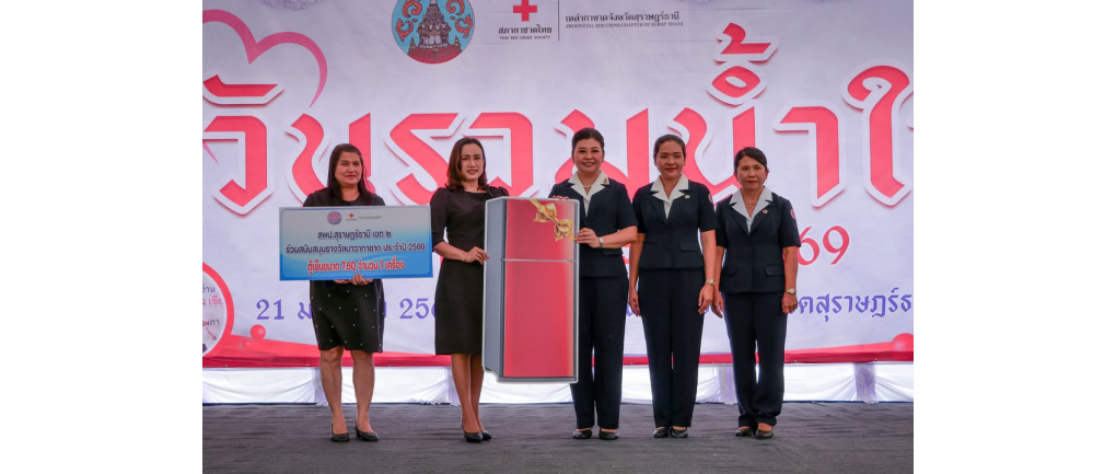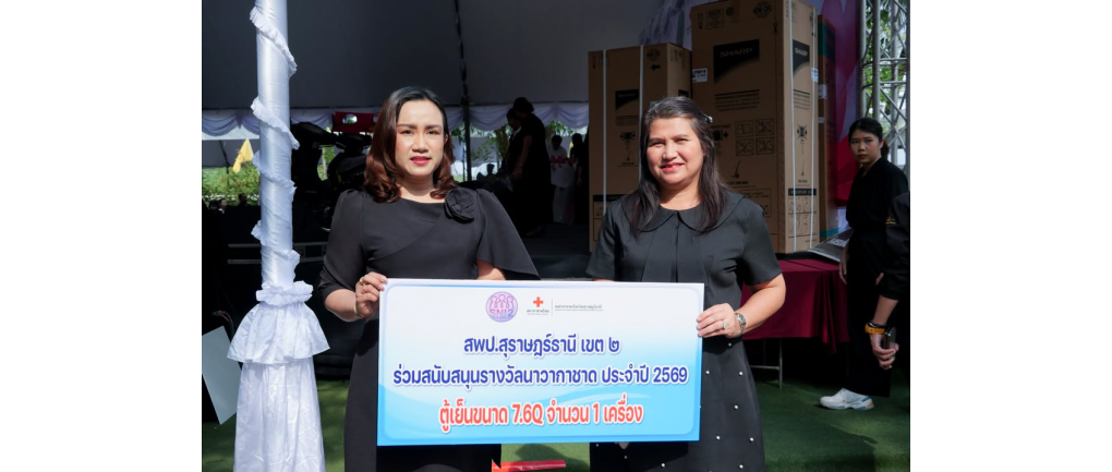 สพป.สุราษฎร์ธานี เขต 2 ร่วมงาน “วันรวมน้ำใจ” มอบตู้เย็นสนับสนุนร้านนาวากาชาด ประจำปี 2569 . วันพุธที่ 21 มกราคม 2569 เวลา 09.00 น. -- นางสาวปวิชญา สินน้อย ผู้อำนวยการสำนักงานเขตพื้นที่การศึกษาประถมศึกษาสุราษฎร์ธานี เขต 2 พร้อมด้วย นางสาวนิตยา อุทัยพันธุ์ ผู้อำนวยการกลุ่มบริหารการเงินและสินทรัพย์และคณะ ได้เดินทางเข้าร่วมงาน “วันรวมน้ำใจ” ซึ่งจัดขึ้นโดยจังหวัดสุราษฎร์ธานีร่วมกับเหล่ากาชาดจังหวัดสุราษฎร์ธานี ณ บริเวณหน้าสำนักงานเหล่ากาชาดจังหวัดสุราษฎร์ธานี ในการนี้ ผู้อำนวยการสำนักงานเขตพื้นที่การศึกษาประถมศึกษาสุราษฎร์ธานี เขต 2 และคณะ ได้ร่วมสนับสนุนของรางวัล เป็น ตู้เย็น ขนาด 7.6 คิว (7.6Q) จำนวน 1 เครื่อง ให้แก่เหล่ากาชาดจังหวัดสุราษฎร์ธานี เพื่อนำไปจัดสรรเป็นรางวัลในการออกร้าน “นาวากาชาด” ภายในงานสมโภชศาลหลักเมืองและกาชาดสุราษฎร์ธานี ประจำปี 2569 ที่กำหนดจัดขึ้นระหว่างวันพฤหัสบดีที่ 5 ถึงวันเสาร์ที่ 14 กุมภาพันธ์ 2569 ณ บริเวณริมเขื่อนแม่น้ำตาปี ทั้งนี้ รายได้จากการออกร้านนาวากาชาด จะถูกนำไปใช้สนับสนุนภารกิจของเหล่ากาชาดจังหวัดสุราษฎร์ธานี ทั้งในด้านการบรรเทาทุกข์ผู้ประสบภัย การสังคมสงเคราะห์แก่ราษฎรที่ยากไร้และผู้ด้อยโอกาส รวมถึงสนับสนุนบริการทางการแพทย์และกิจกรรมสาธารณกุศลอื่น ๆ ของสภากาชาดไทยต่อไป