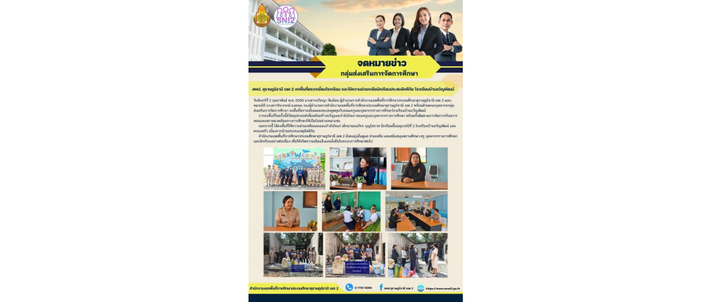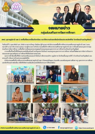 สพป. สุราษฎร์ธานี เขต 2 ลงพื้นที่ตรวจเยี่ยมโรงเรียน และให้ความช่วยเหลือนักเรียนประสบอัคคีภัย โรงเรียนบ้านขวัญพัฒน์ วันจันทร์ที่ 2 กุมภาพันธ์ พ.ศ. 2569 นางสาวปวิชญา สินน้อย ผู้อำนวยการสำนักงานเขตพื้นที่การศึกษาประถมศึกษาสุราษฎร์ธานี เขต 2 มอบหมายให้ นางสาวริยาภรณ์ ยงคณะ รองผู้อำนวยการสำนักงานเขตพื้นที่การศึกษาประถมศึกษาสุราษฎร์ธานี เขต 2 พร้อมด้วยคณะบุคลากรกลุ่มส่งเสริมการจัดการศึกษา ลงพื้นที่ตรวจเยี่ยมและพบปะพูดคุยกับคณะครูและบุคลากรทางการศึกษาโรงเรียนบ้านขวัญพัฒน์ การลงพื้นที่ในครั้งนี้มีวัตถุประสงค์เพื่อเสริมสร้างขวัญและกำลังใจแก่ คณะครูและบุคลากรทางการศึกษา พร้อมทั้งติดตามการจัดการเรียนการสอนและสภาพแวดล้อมทางการศึกษาให้เป็นไปอย่างเหมาะสม นอกจากนี้ ได้ลงพื้นที่ให้ความช่วยเหลือและมอบกำลังใจแก่ เด็กชายธนภัทร บุญโสภาส นักเรียนชั้นอนุบาลปีที่ 2 โรงเรียนบ้านขวัญพัฒน์ และครอบครัว เนื่องจากบ้านประสบเหตุอัคคีภัย สำนักงานเขตพื้นที่การศึกษาประถมศึกษาสุราษฎร์ธานี เขต 2 ยังคงมุ่งมั่นดูแล ช่วยเหลือ และสนับสนุนสถานศึกษา ครู บุคลากรทางการศึกษา และนักเรียนอย่างต่อเนื่อง เพื่อให้เกิดความเข้มแข็งและยั่งยืนในระบบการศึกษาต่อไป