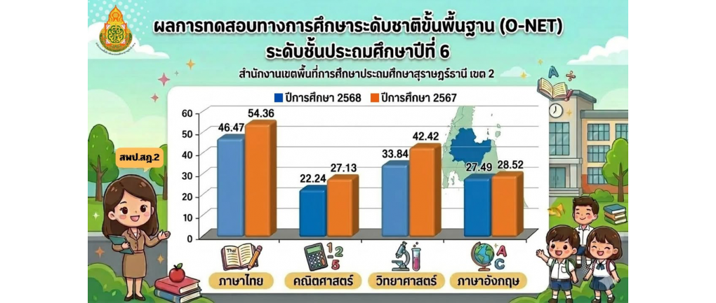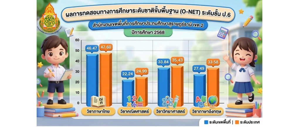 สรุปรายงานผลการทดสอบทางการศึกษาระดับชาติขั้นพื้นฐาน (O-NET) ระดับชั้นประถมศึกษาปีที่ 6 ประจำปีการศึกษา 2568 โดยมีประเด็นวิเคราะห์เปรียบเทียบกับระดับประเทศและผลการสอบในปีที่ผ่านมา ดังนี้