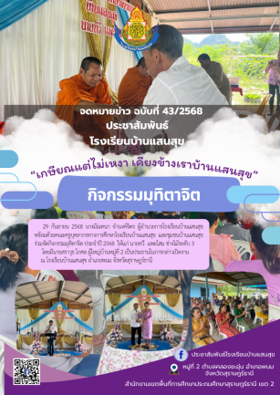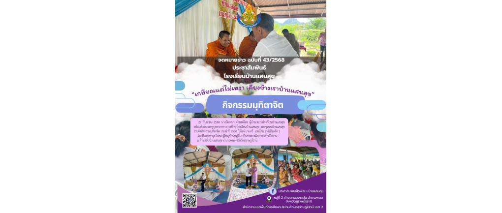 29 กันยายน 2568 นางมัณทนา จำนงค์จิตร ผู้อำนวยการโรงเรียนบ้านแสนสุข พร้อมด้วยคณะครูบุคลากรทางการศึกษาโรงเรียนบ้านแสนสุข และชุมชนบ้านแสนสุข ร่วมจัดกิจกรรมมุทิตาจิต ประจำปี 2568 ให้แก่ นายทวี แพะโสม ช่างไม้ระดับ 3