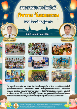 วัน พุธ ที่ 5 พฤศจิกายน 2568 โรงเรียนบ้านอรุโณทัย นำโดย นางจุรีย์พร นิลสังข์ ผู้อำนวยการโรงเรียน นายทวีพงษ์ แซ่ตั้ง รองผู้อำนวยการโรงเรียน พร้อมด้วยคณะครู นักเรียน และบุคลากรทางการศึกษา ได้จัดกิจกรรมวันลอยกระทง ประจำปีการศึกษา 2568 มีวัตถุประสงค์เพื่อให้นักเรียน ครู และบุคลากร มีส่วนร่วมและถ่ายทอดประเพณีวัฒนธรรมที่สำคัญของท้องถิ่นและรู้จักอนุรักษ์ประเพณีวันลอยกระทง