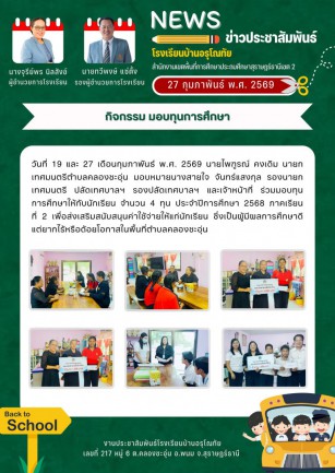 วันที่ 19 และ 27 เดือนกุมภาพันธ์ พ.ศ. 2569 นายไพฑูรณ์ คงเดิม นายกเทศมนตรีตำบลคลองชะอุ่น มอบหมายนางสายใจ จันทร์แสงกุล รองนายกเทศมนตรี ปลัดเทศบาลฯ รองปลัดเทศบาลฯ และเจ้าหน้าที่ ร่วมมอบทุนการศึกษา